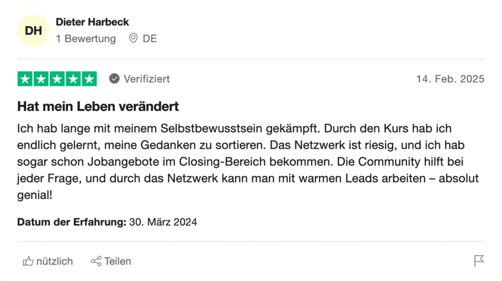 Die Community hilft bei jeder Frage, und durch das Netzwerk kann man mit warmen Leads arbeiten – absolut genial!